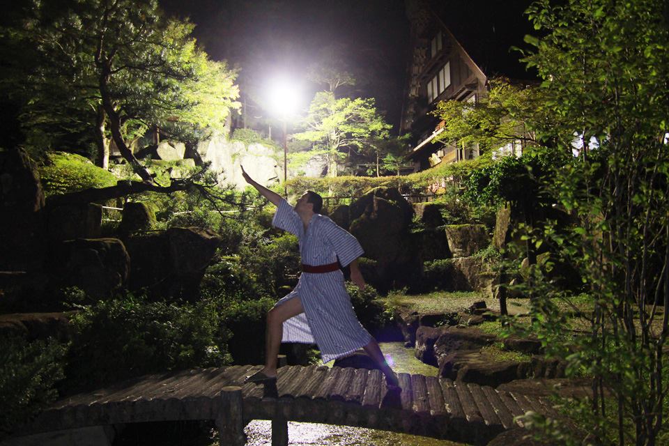 Dès notre arrivée en début de soirée, j’ai trouvé dans ce ryokan ce que j’étais venu chercher : une bâtisse à l’orée d’un bois, imposante maison familiale, avec une forte atmosphère. Un chemin pentu, tortueux, nous a emmené du petit parking à la maison familiale, à travers un jardin peu éclairé et sa mare enjambé par un petit pont de bois. C’était à la fois flippant, irréel et terriblement attractif à la fois ! Il faut dire qu’au Japon, on se sent toujours en sécurité.
