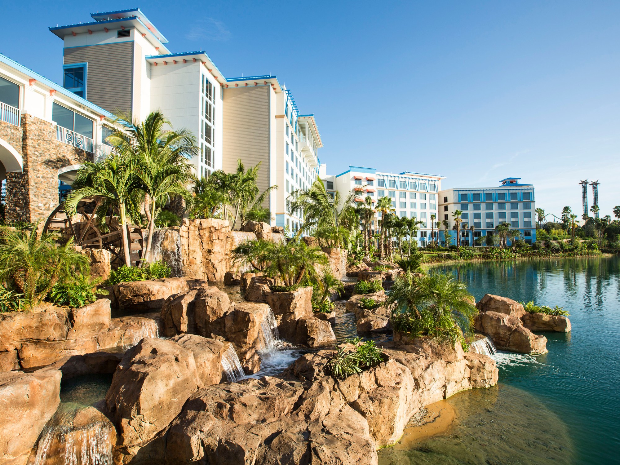 Fidèle au style d’Universal, l’hôtel a pour inspiration les Caraïbes mais avec un twist contemporain. On est pas dans une hyper-thématisation rétro comme le proposent les hôtels de Walt Disney World. Ici les couleurs pastel et les matériaux rustiques se mêlent à un design chic et épuré, propice à la détente. Un travail important a été réalisé sur les plans d’eau, cascades et végétation. La piscine est la plus grande d’Universal Orlando, et dispose de son jacuzzi, d’un toboggan, d’un bar avec un foyer en extérieur, idéal pour faire griller ses marshmallows, manger léger ou boire un verre en soirée. Il en résulte un mix intéressant, à la fois familial mais pas enfantin, « exotic chic » qui plaira aussi à la clientèle d’affaires qui est aussi directement visée, puisque l’hôtel partage un grand centre de congrès avec le Royal Pacific Resort juste à côté.