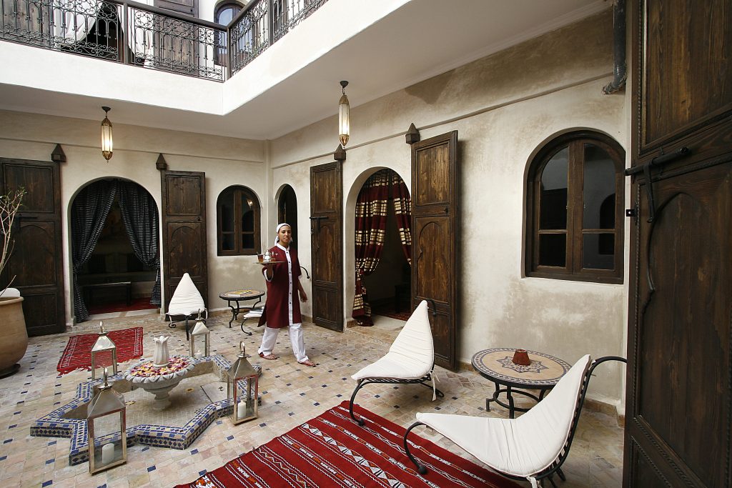 D’abord un accueil chaleureux : installez vous dans les canapés et goûtez les quelques pâtisseries orientales que l’on vous apporte sur un plateau. Votre hôte vous fera signer toutes les formalités obligatoires, et vous donnera les plans et conseils nécessaires au bon déroulement du séjour. Un riad est une maison traditionnelle des médinas marocaines, allant de 1 à 4 étages, aménagés autour de un ou plusieurs patios. Elle est entourée de larges murs protégeant de la chaleur marocaine, mais aussi du bruit de la ville. Vous serez ici au calme et au frais, prêts à profiter de la douceur de vivre que propose le Riad al Rimal.