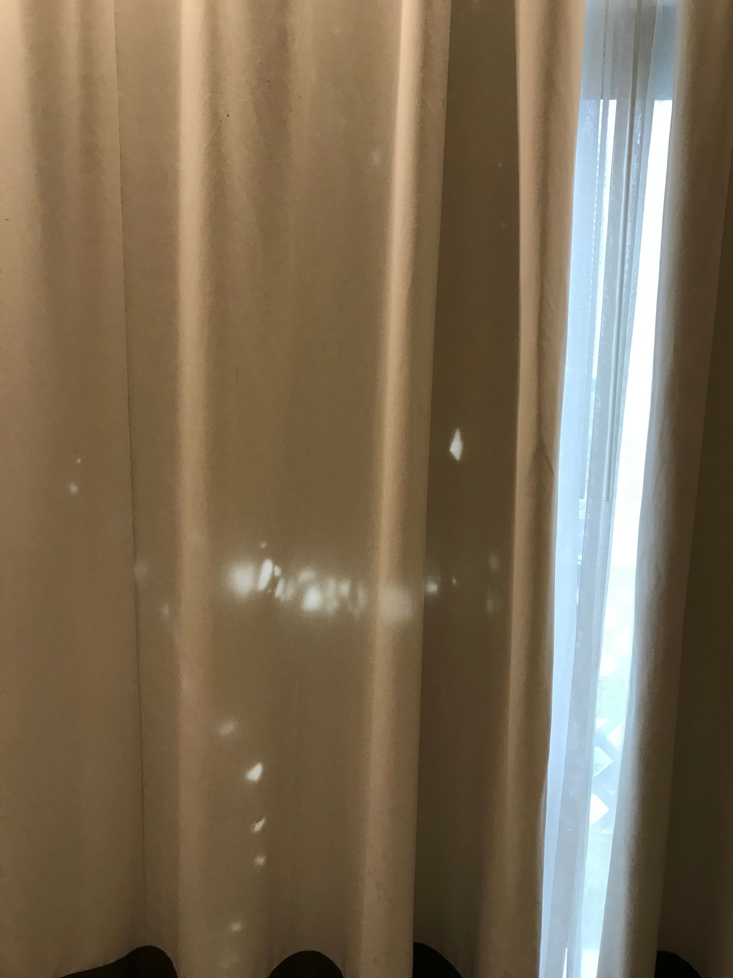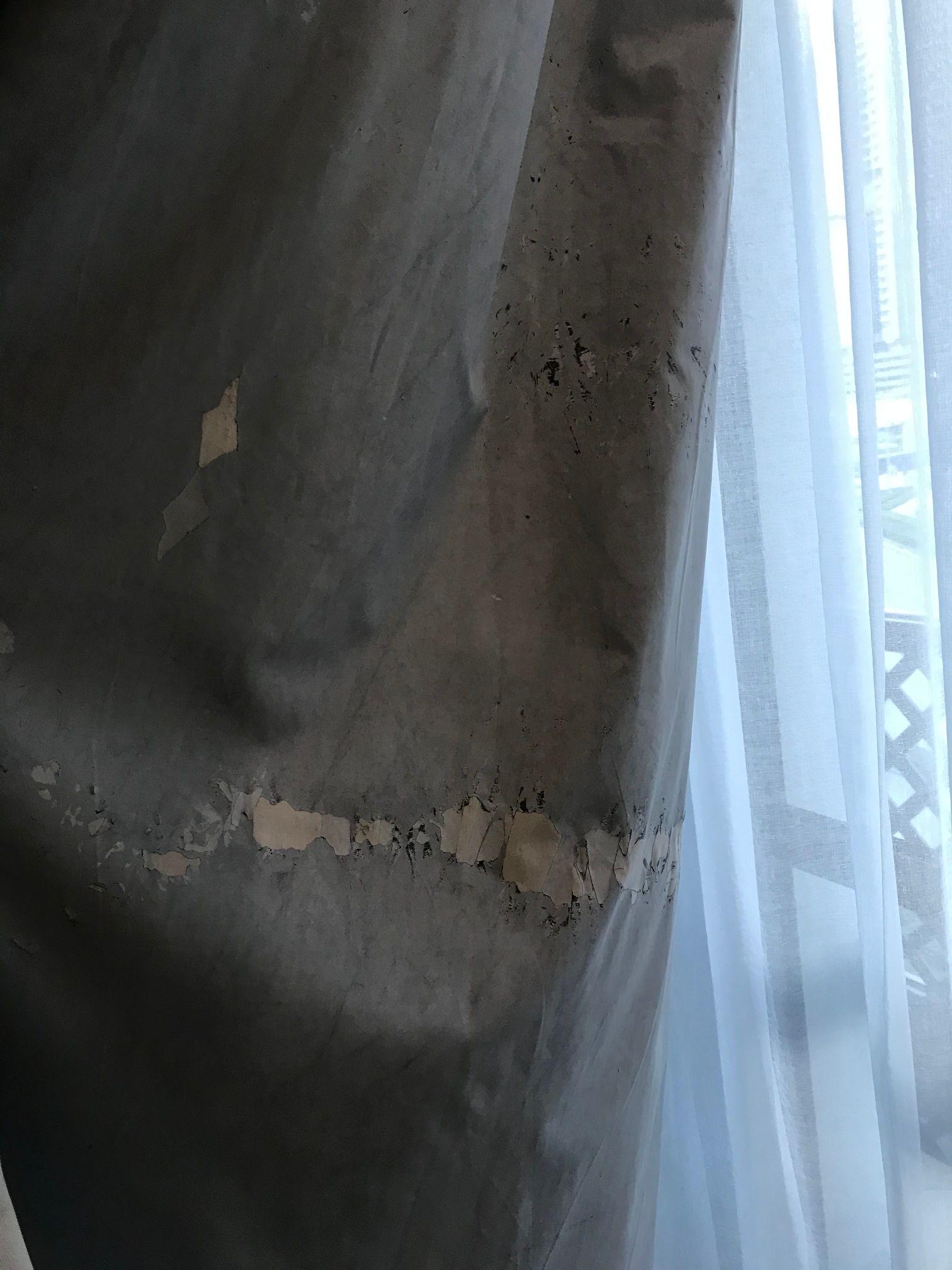 Point négatif : l’arrière de nos rideaux était très usé par endroit. Ça ne se voyait pas depuis la chambre de nuit, mais avec les rideaux tirés, cela créé des puits de lumière là où le tissu était abîmé.