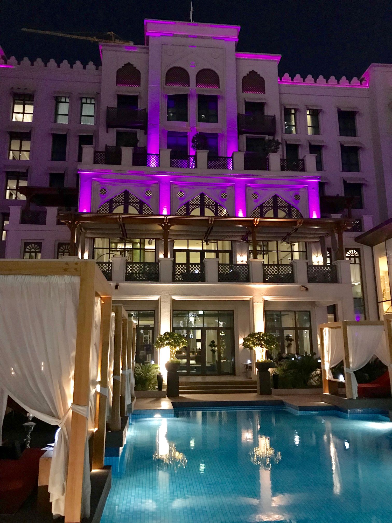 L’hôtel ne propose pas de spa, mais il y a néanmoins une piscine au RDC, étonnamment placée sur la rue elle-même juste derrière un mur isolant. Elle est assez petite et souvent à l’ombre, nous ne l’avons pas trouvée très attractive malgré les transats au bord de l’eau, et ne nous y sommes pas baignés (il ne faisait pas super chaud non plus, ça explique aussi cela). C’est d’ailleurs beaucoup plus joli de nuit avec les lumières allumées, qui parent le bâtiment de teintes roses et violettes.