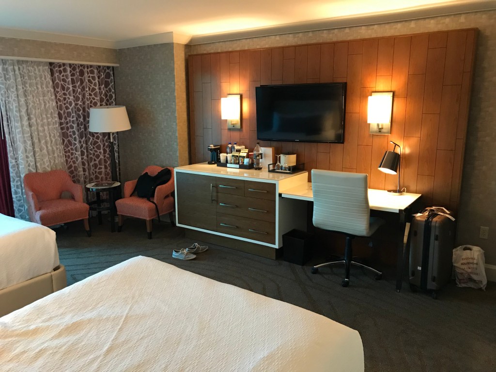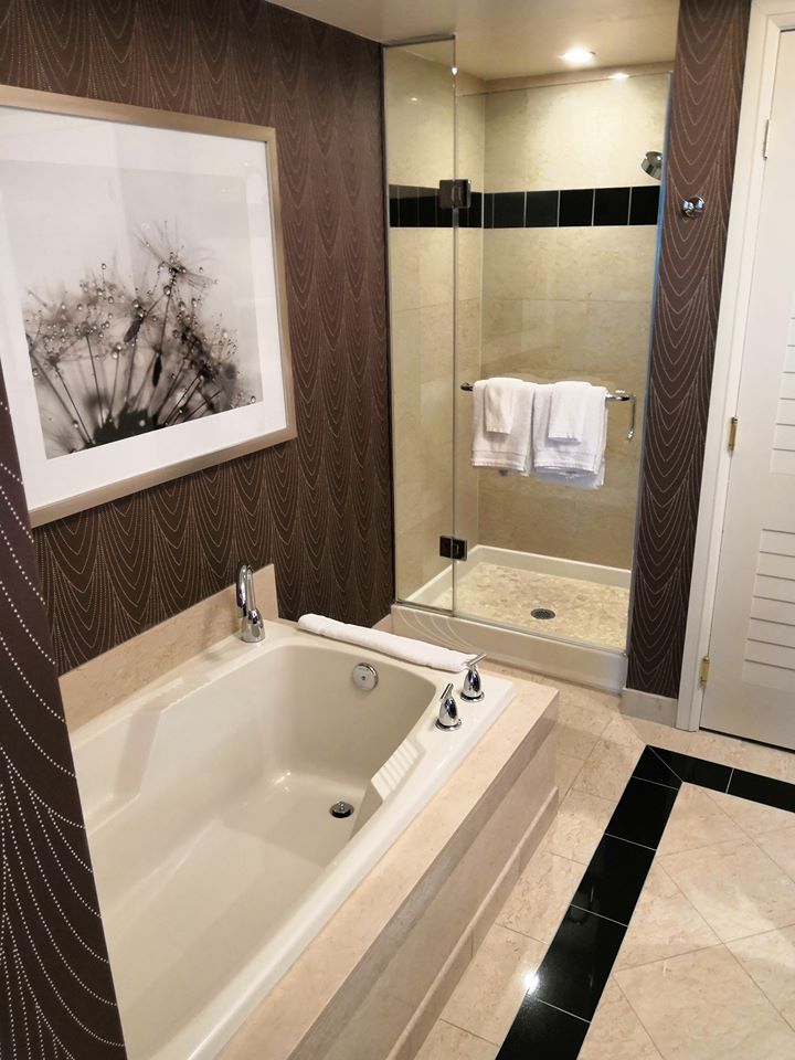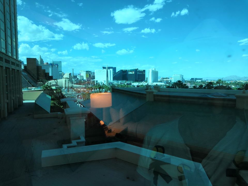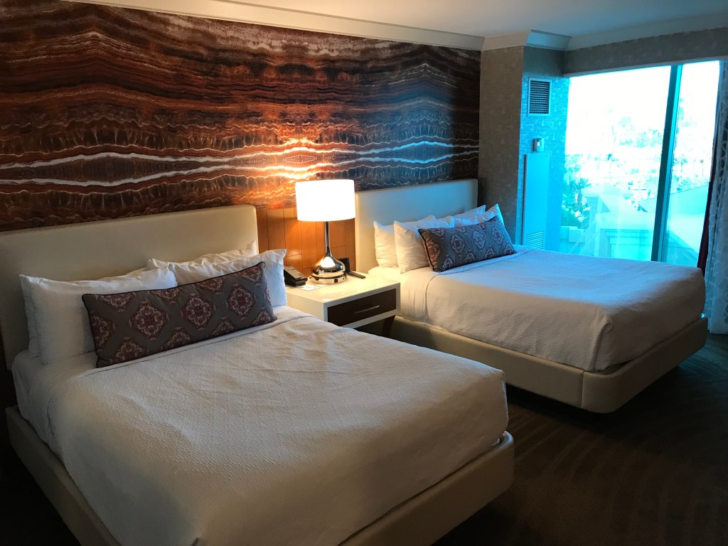 Dans les chambres le thème se fait encore plus discret, à part quelques couleurs chaudes et vives, et les portes de salle de bain en blanc colonial. Elles sont juste très élégantes, spacieuses, confortables, et très propres. Un petit havre de paix après avoir déambulé dans des kilomètres de casinos et couloirs sans fenêtres. Comme souvent à Vegas, pas de balcon, il faudra vous contenter de l’air conditionné. La vue vers l’extérieur est malheureusement altérée par une teinte de vitre qui assombrit l’ensemble.