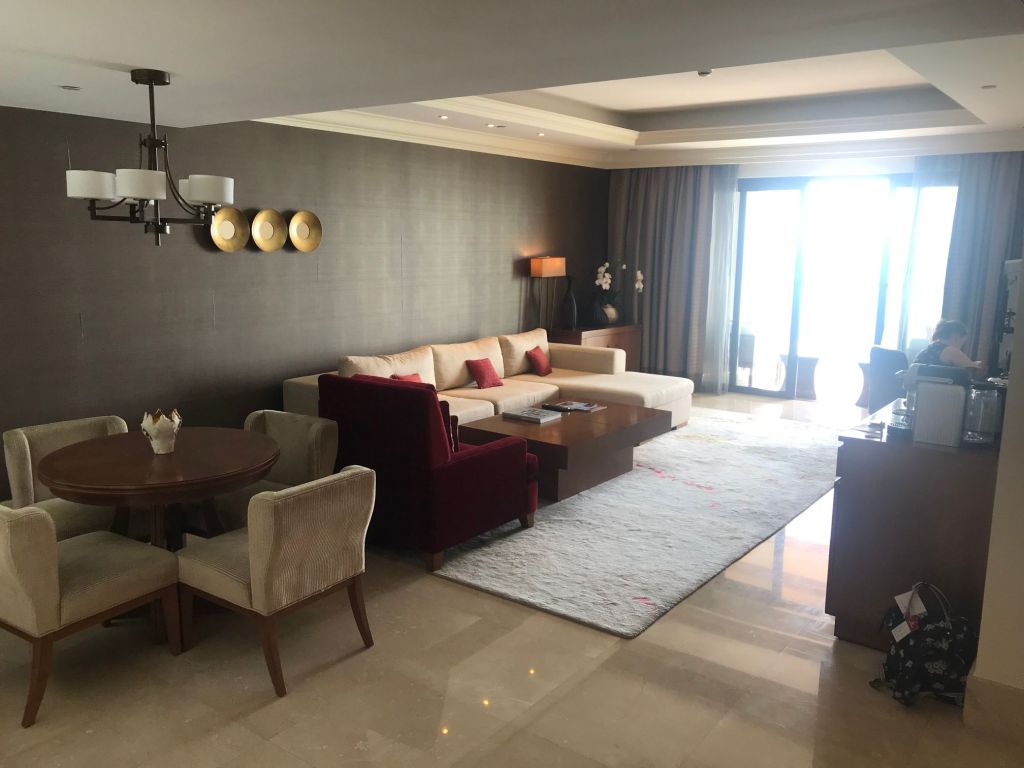 Nous avons eu la chance et la surprise de bénéficier d’un surclassement lors de notre check in. J’avais demandé une chambre loin des chantiers avoisinants, et malgré que l’hôtel soit plein ce weekend, la direction avait tenu à répondre à ma demande en me plaçant le plus loin possible des nuisances, en hauteur. Résultat : une suite au 10ème étage de l’hôtel, plus grand que notre appartement français… une vraie surprise d’autant plus que nous avions déjà droit à un tarif hyper avantageux !