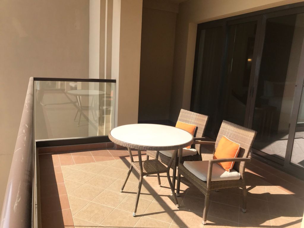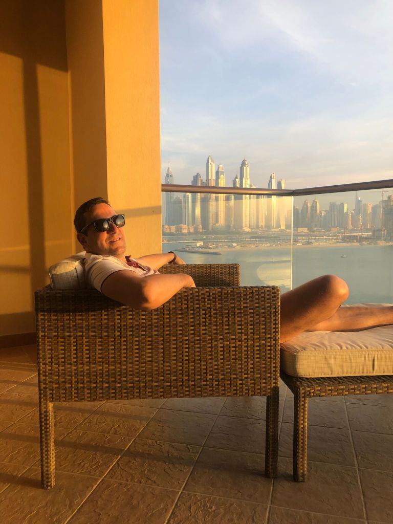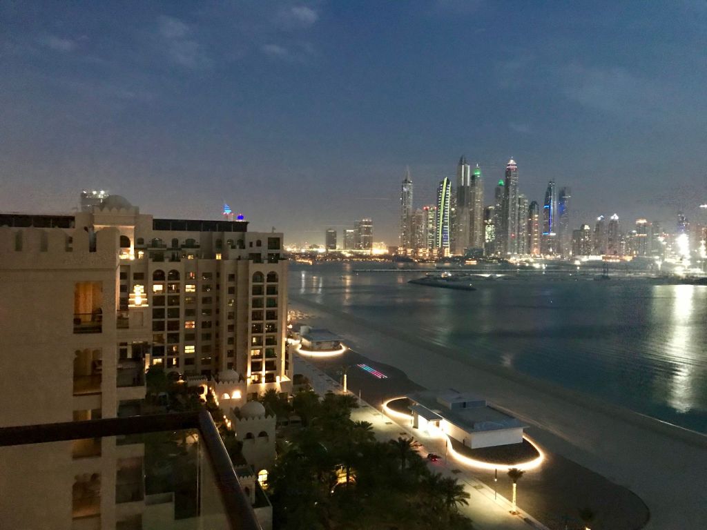 La terrasse, accessible directement depuis la chambre et le salon, proposait une vue absolument démente sur la marina voisine, Palm Jumeirah, le nouveau Dubai Harbour en construction et l’horizon avec coucher de soleil sur la mer. Nous y avons forcément passé du temps en soirée !