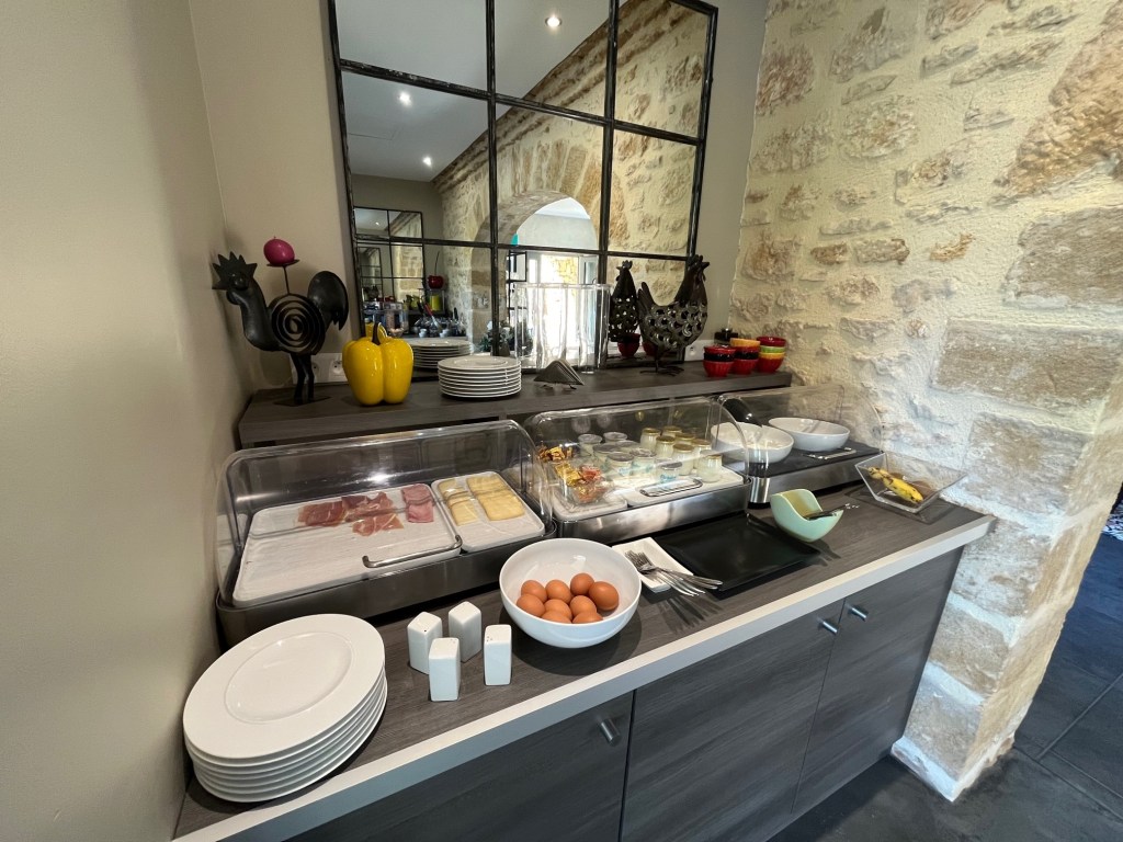 On vous sert un assortiment de viennoiseries, de pain frais, de gâteaux. Mais aussi de yaourts, fromage blanc, compote, fruits frais, un assortiment de fruits secs et de céréales, ainsi qu’un buffet composé de jambon blanc et d’un jambon de pays artisanal, de 2 variétés différentes de fromage d’Aquitaine et d’œufs durs. Enfin une sélection de cafés, chocolat, thés Dammann et jus de fruits accompagneront votre petit déjeuner ainsi qu’un large choix de confitures. Il existe aussi une sélection de produits » sans gluten ». En résumé, l’offre est satisfaisante, mais le prix est un peu élevé. Le nombre de viennoiseries est limité, et dans beaucoup d’établissements, ce type de petit déjeuner serait inclus.