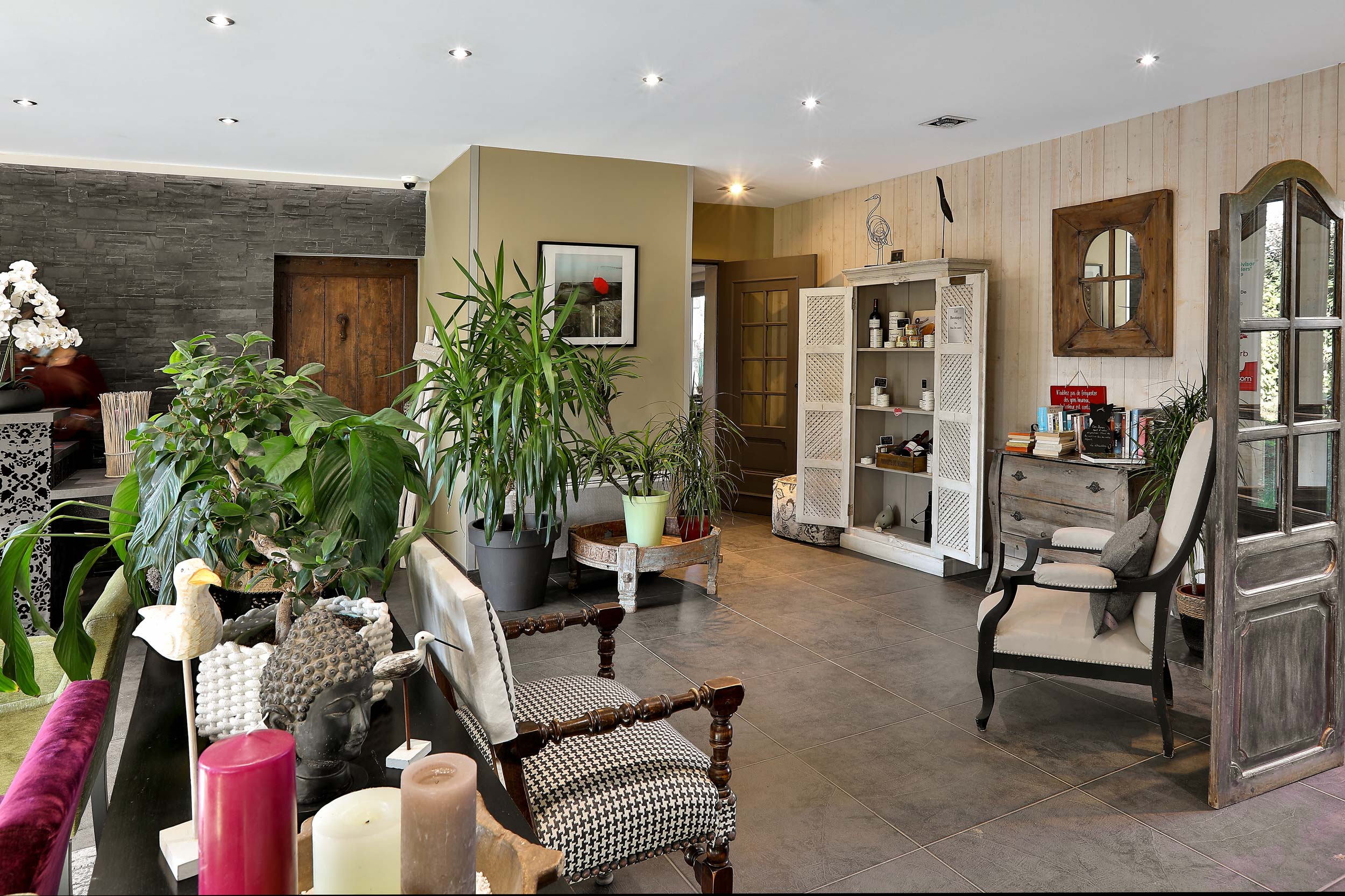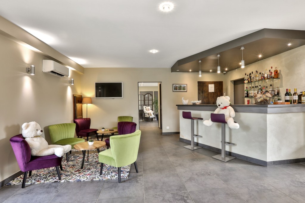 La décoration est familiale et locale dans le hall, avec des brochures touristiques, ses ours en peluche géants, des objets locaux d’artisans, des produits du terroir à emporter en souvenir…