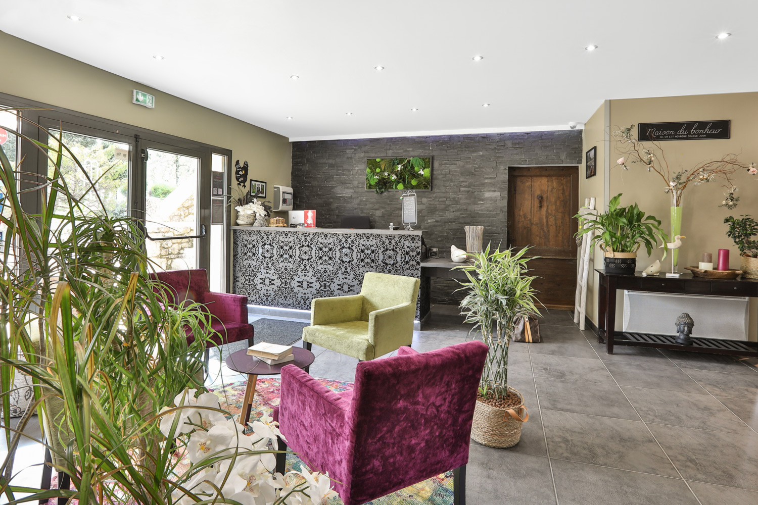 Le hall mène à certaines chambres double mais aussi une partie bar et restaurant qui se veut plus contemporaine, colorée et minimaliste, le tout avec de grandes baies vitrées donnant sur la magnifique piscine. Les extensions avec chambres sont dans des bâtiments plus classiques, mais toutes bénéficient d’une décoration similaire qui a été refaite en 2022.
