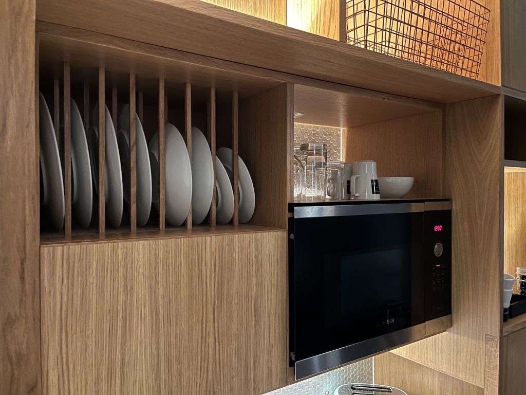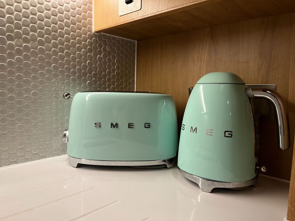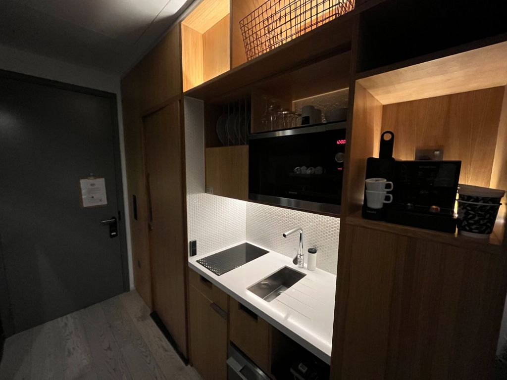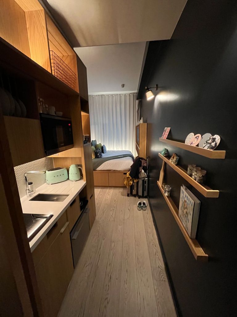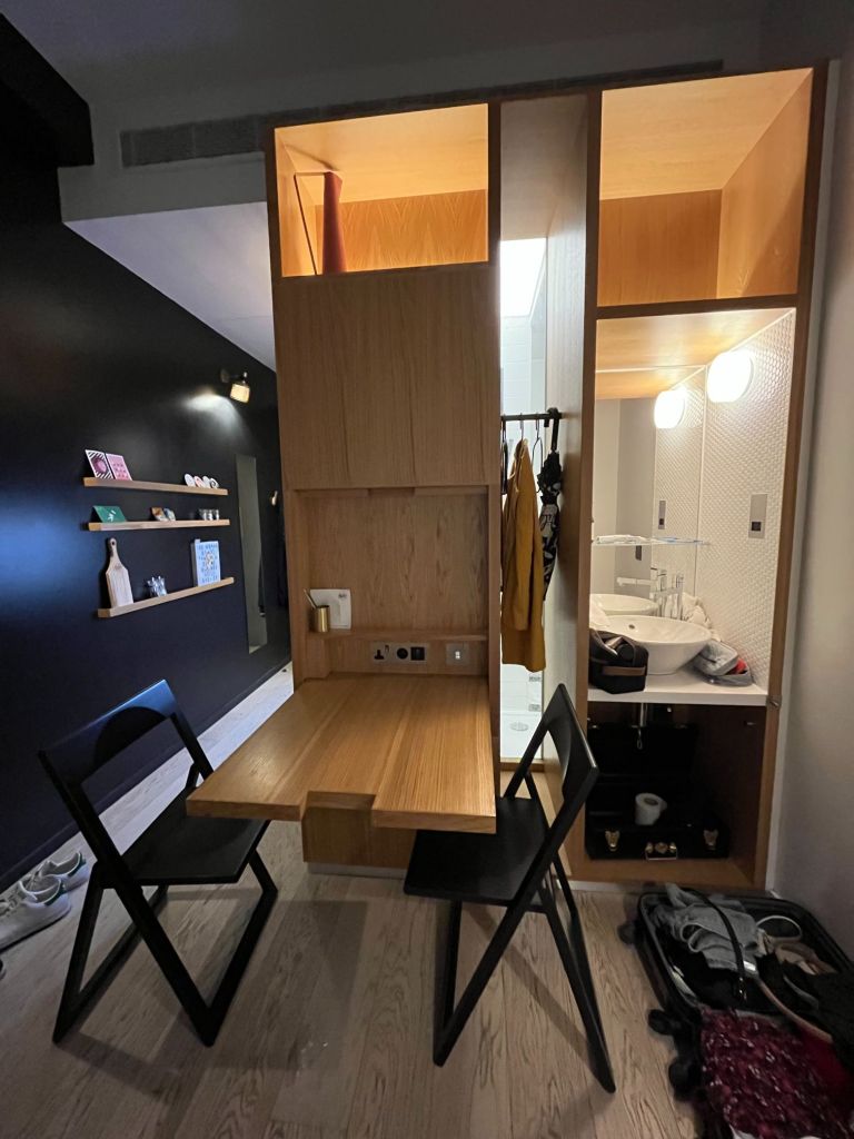 Avec un grand lit king size (2m de large), un écran TV plat géant accroché au mur, plein de prises USB, une kitchenette toute équipée (y compris électro ménager SMEG), des agencements et rangements intelligents, des petites touches gourmandes (biscuits et bouteilles d’eau de courtoisie), des éclairages cozy, la climatisation, les chambres sont confortables et très accueillantes, avec un petit côté Ikéa cocooning très sympa. Encore une fois, la place a été totalement optimisée, y compris pour faire rentrer dans ce studio une douche à l’italienne, des toilettes et un lavabo séparé dans la chambre. Mention spéciale aux rangements sous le lit, à la table à manger qui se plie et se déplie depuis la penderie etc. Franchement, c’est le genre de studio où on passerait bien son année universitaire !