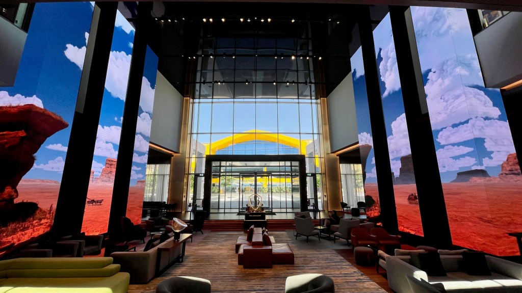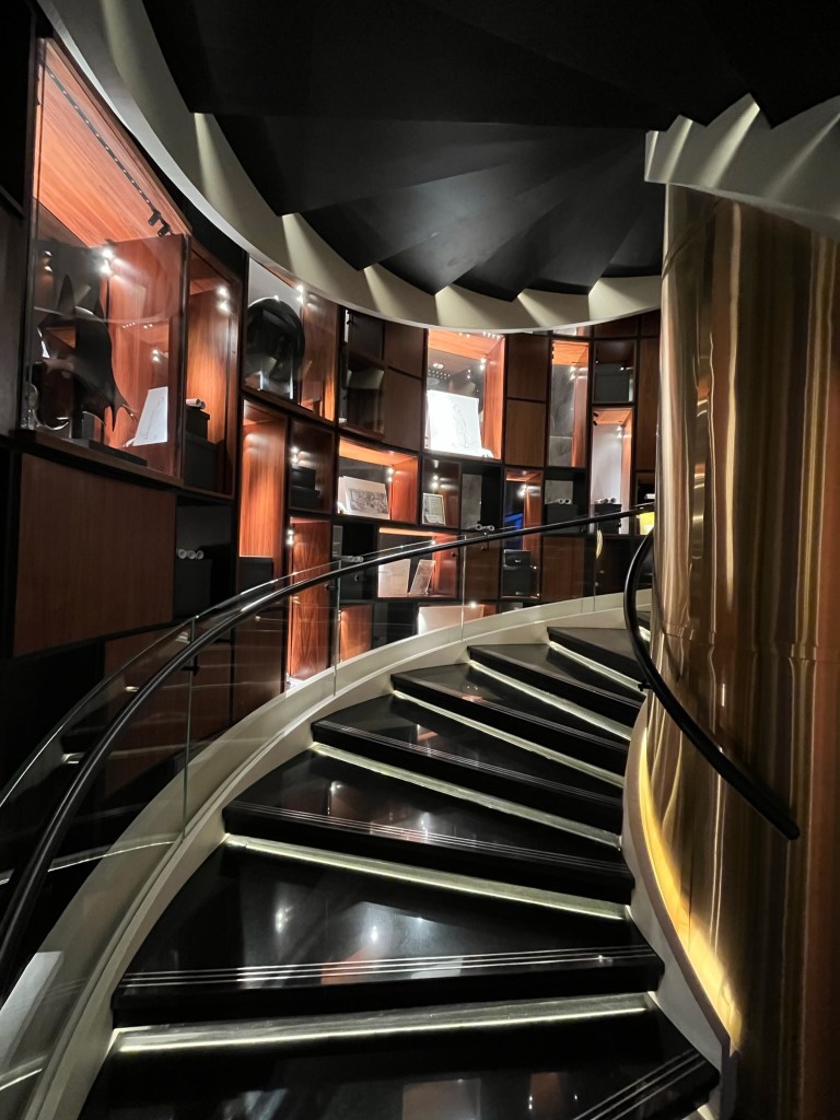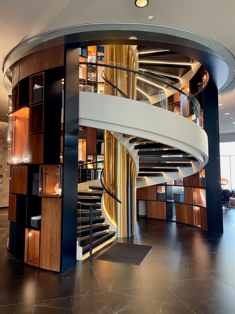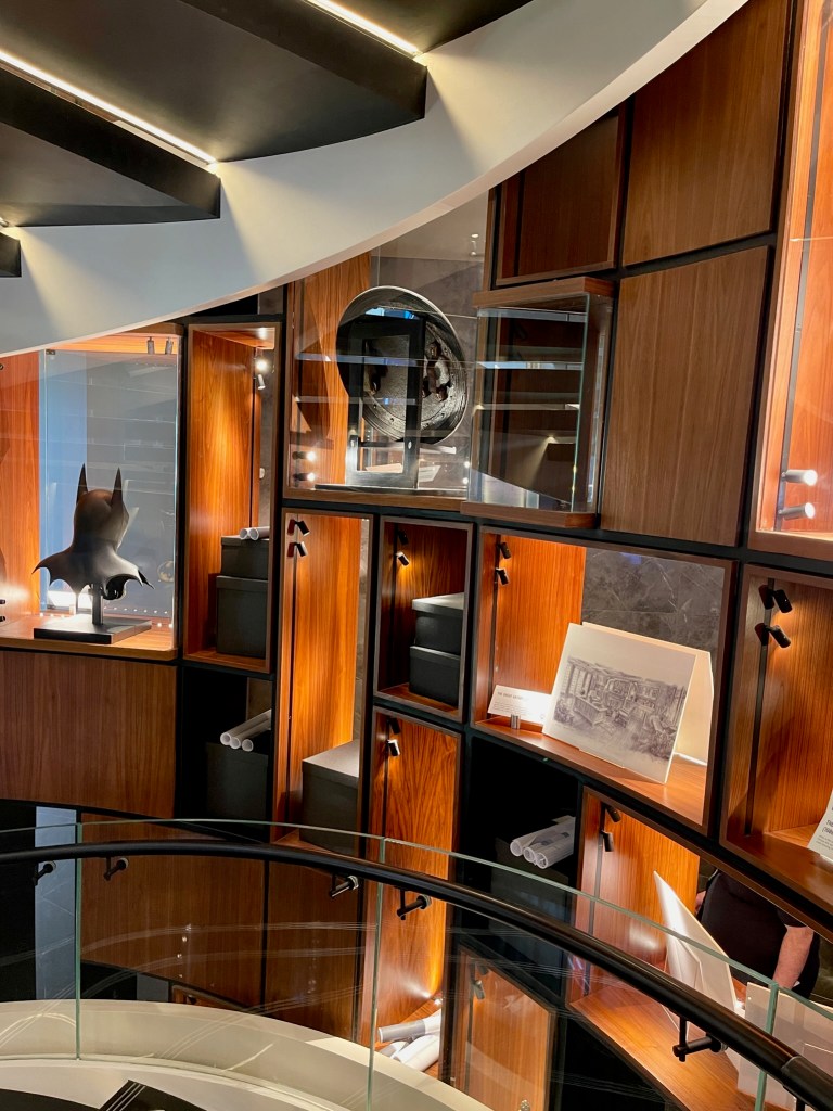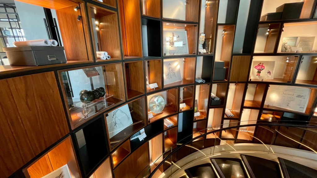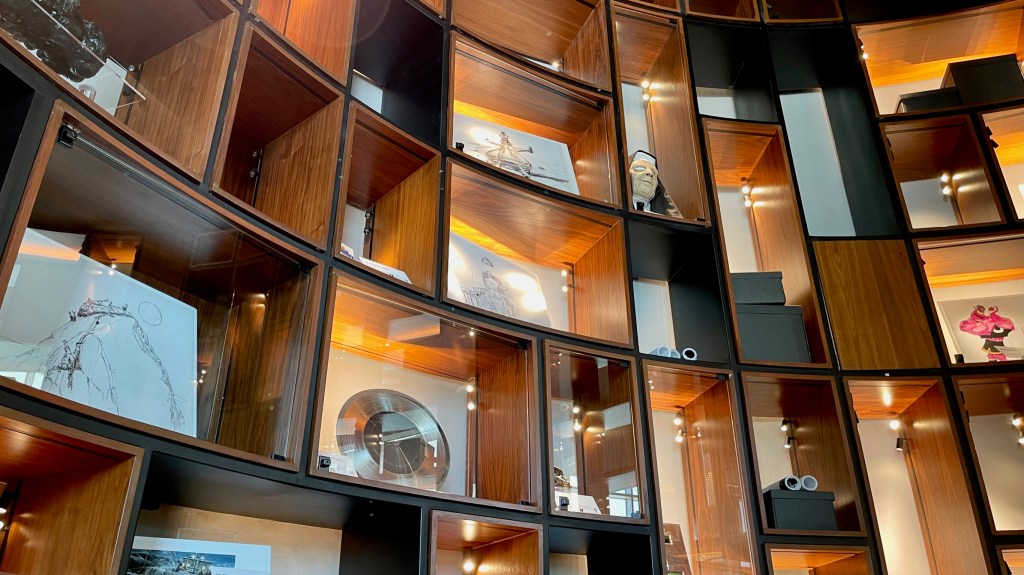 En arrivant à la porte cochère, on comprend alors le positionnement de l’hôtel, qui vise sans doute plusieurs clientèles. A l’image d’un Disney Hotel New York – The Art of Marvel, l’hôtel se veut chic et contemporain, avec des hommages à l’histoire et les créations des Studios Warner Bros, représentées en filigrane. Ce n’est pas une extension du parc à thèmes, mais presque un mini « musée » mis en scène dans un hôtel classe et moderne. Les touches et références Warner sont partout, mais la scénographie reste toujours classieuse et ne vous saute pas à la figure. On parle d’écrans géants, de murs digitaux, de subtiles références décoratives ou d’archives passionnantes exposées judicieusement sous vitrine le long d’un grand escalier en spirale.