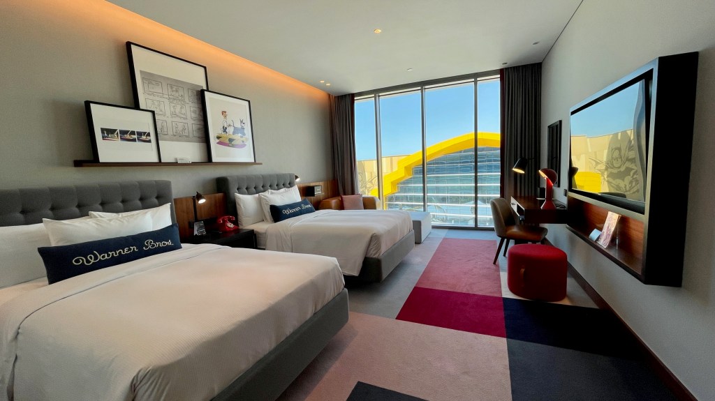 Le WB Hotel Abu Dhabi (WB pour « Warner Bros », attention quand vous le cherchez dans des sites de voyage) est le premier hôtel officiel dédié aux studios Warner Bros. Il était tout naturel qu’il ouvre ses portes juste en face du parc indoor Warner Bros World, pour prolonger et complémenter l’expérience du dit parc à thèmes. Ce fut le cas à la fin de la pandémie, puisque l’hôtel date de novembre 2021, et nous avons pu le tester très récemment. Nous étions assez curieux de voir comment se positionne cet hôtel familial 5 étoiles, sachant que les émirats proposent déjà pléthores d’hôtels familiaux de qualité.