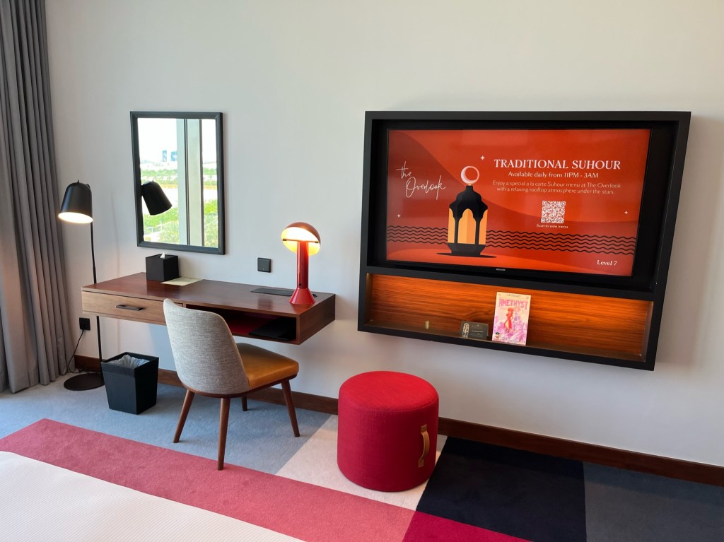 Malgré des couleurs pop et un mobilier qui donnent aux chambres un côté un peu rétro mais plus proche des années 50/60 que de l’âge d’or d’Hollywood, on pourra regretter un petit manque de fantaisie malgré tout le confort disponible. En terme d’hôtel célébrant le cinéma, les chambres du Paramount Hotel Dubai poussent le détail plus loin par exemple, et notamment les suites à thème. Ici peu de glamour, une décoration assez sobre, colorée pour les familles sans doute, mais pas magique ou digne d’un 5 étoiles (avis perso). La vue donne soit sur le (bâtiment du) parc, soit sur la piscine et le parking. Franchement, ça ne change pas grand chose.