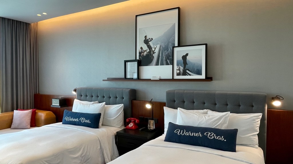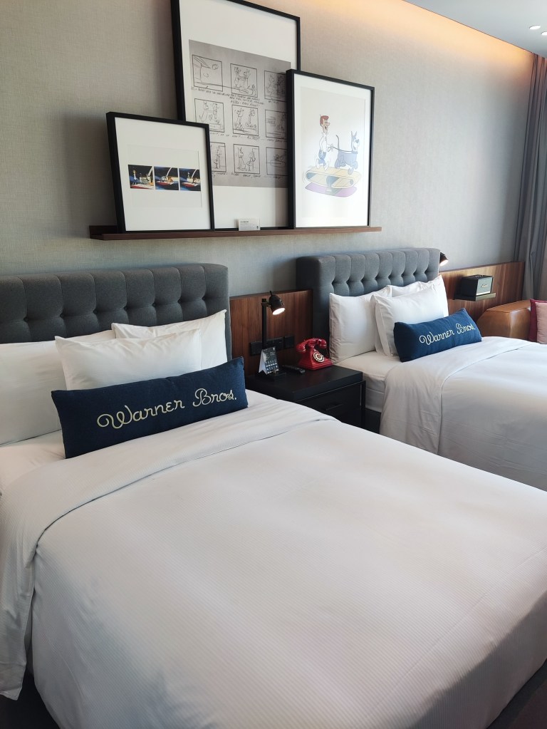 Elles sont globalement peu thémées et se ressemblent toutes, les touches Warner venant de certains tableaux liés à des films ou franchises, et des coussins brodés Warner sur les lits.