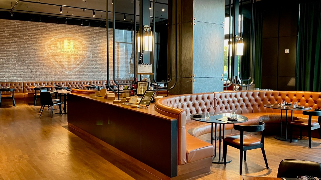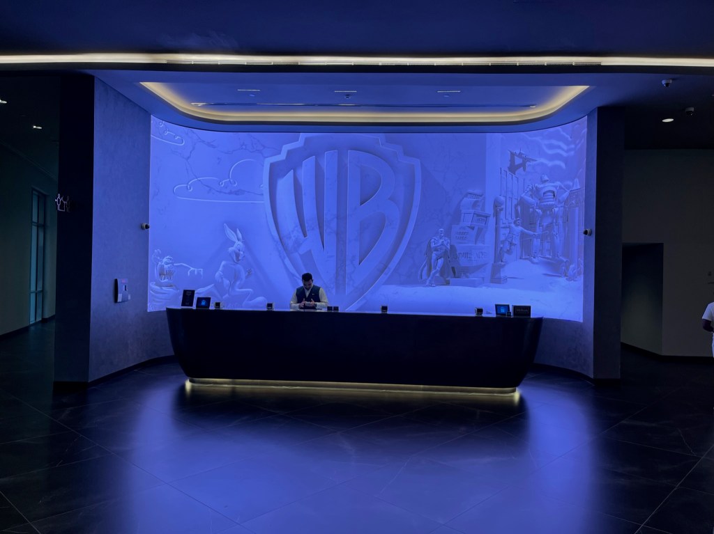 Néanmoins, le parc étant lui-même entièrement indoor et enfermé dans une grosse boîte non thématisée de l’extérieur, au moins l’hôtel ne jure pas et se fond dans le décor. De plus, la façade se part d’un immense logo WB chromé du plus bel effet !